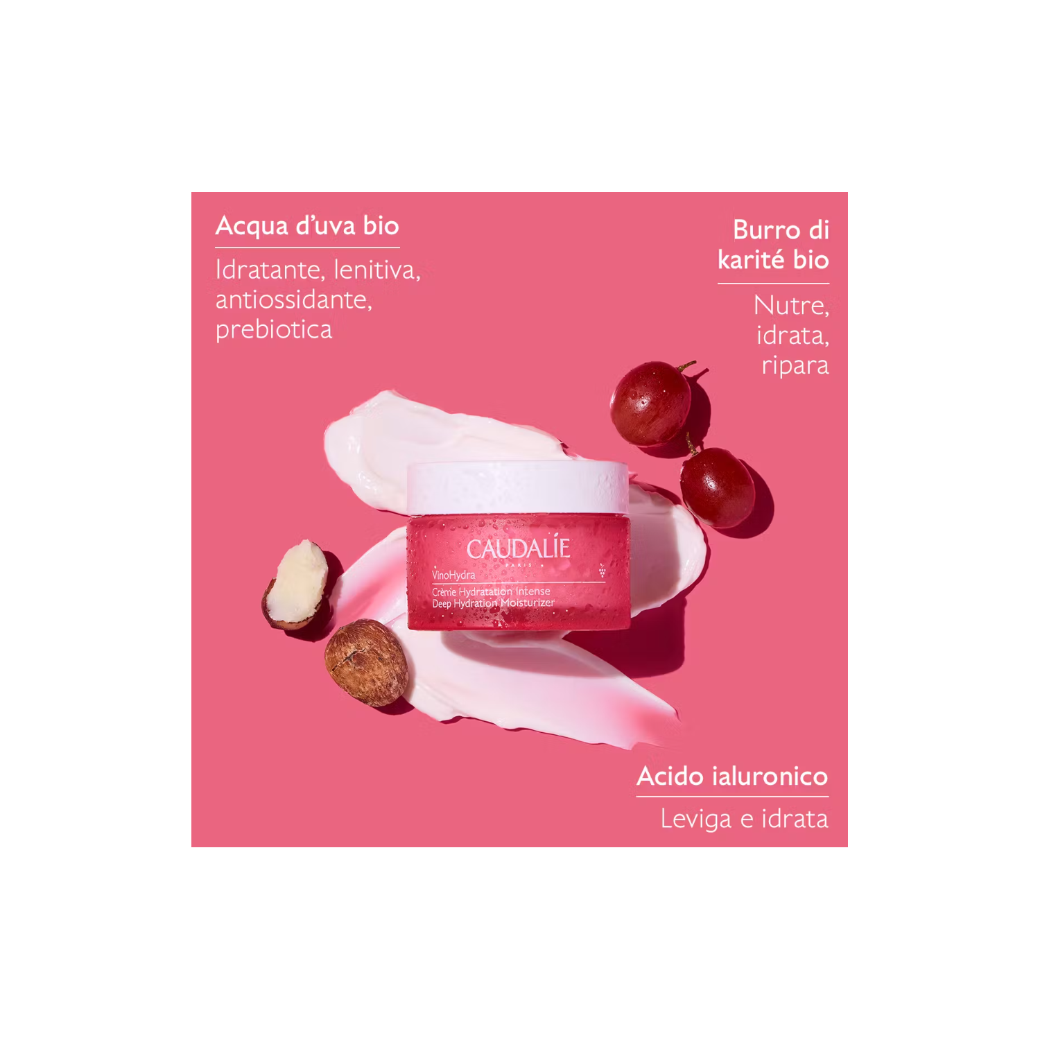 Ingredienti principali : Acido Ialuronico, Burro di karité bio, Acqua d’uva bio