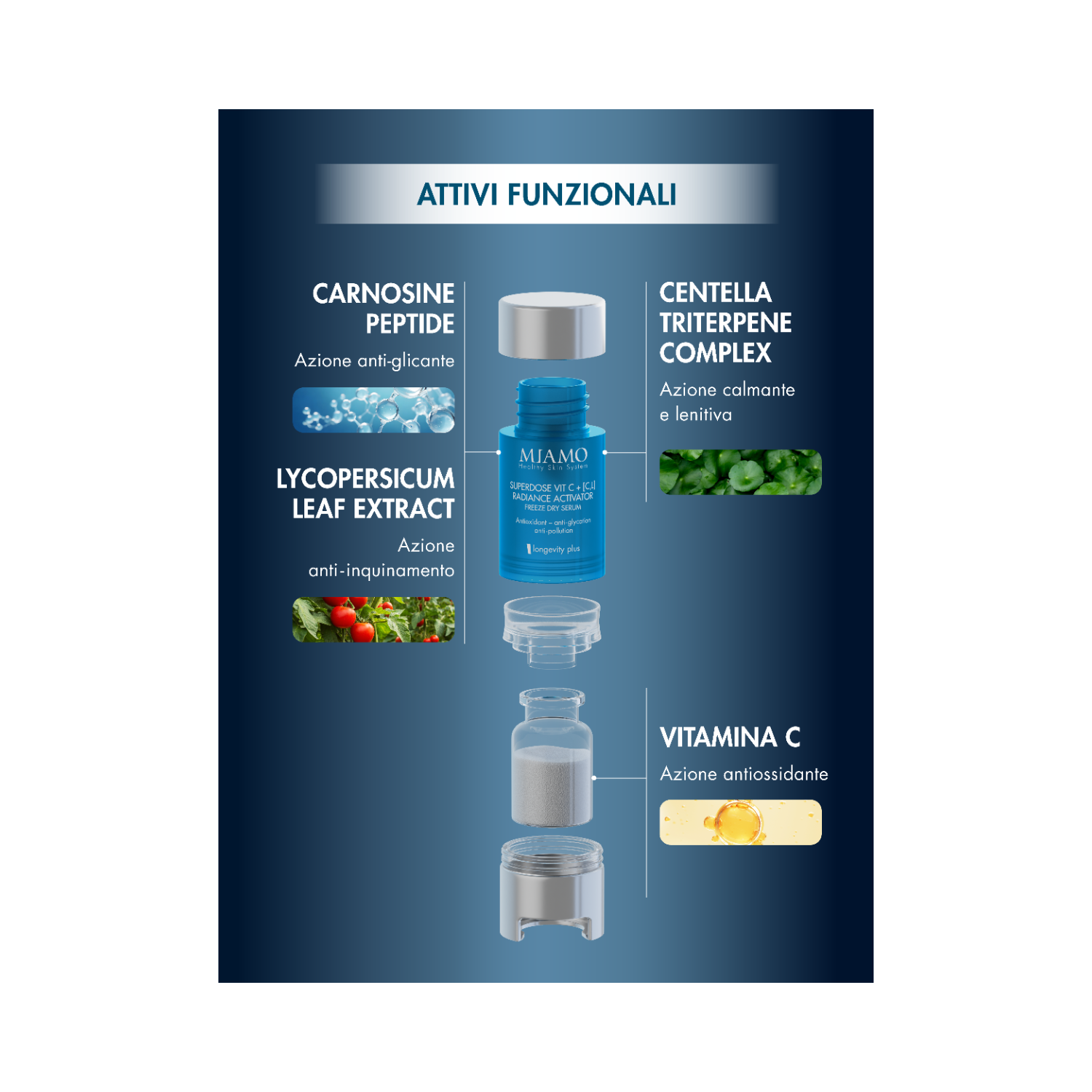 La tecnologia Freeze Dry (liofilizzazione) è un processo che consente di rimuovere l’acqua dagli attivi a basse temperature, preservandone integrità, stabilità ed efficacia nel tempo. L’ampolla multidose è composta da un sistema a doppia camera che separa la fase liquida dalla polvere liofilizzata, assicurando la massima stabilità della formula. I due comparti si miscelano solo nel momento dell’attivazione, consentendo la formazione di una soluzione fresca, altamente efficace e pronta all'uso..
