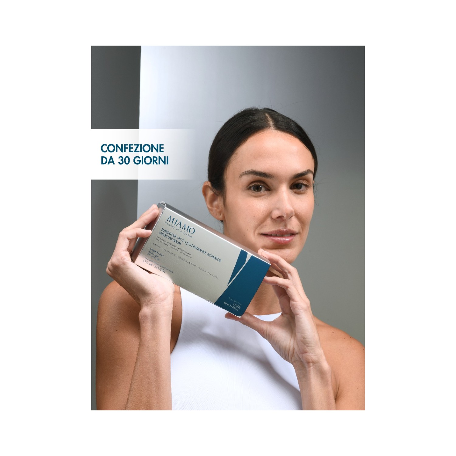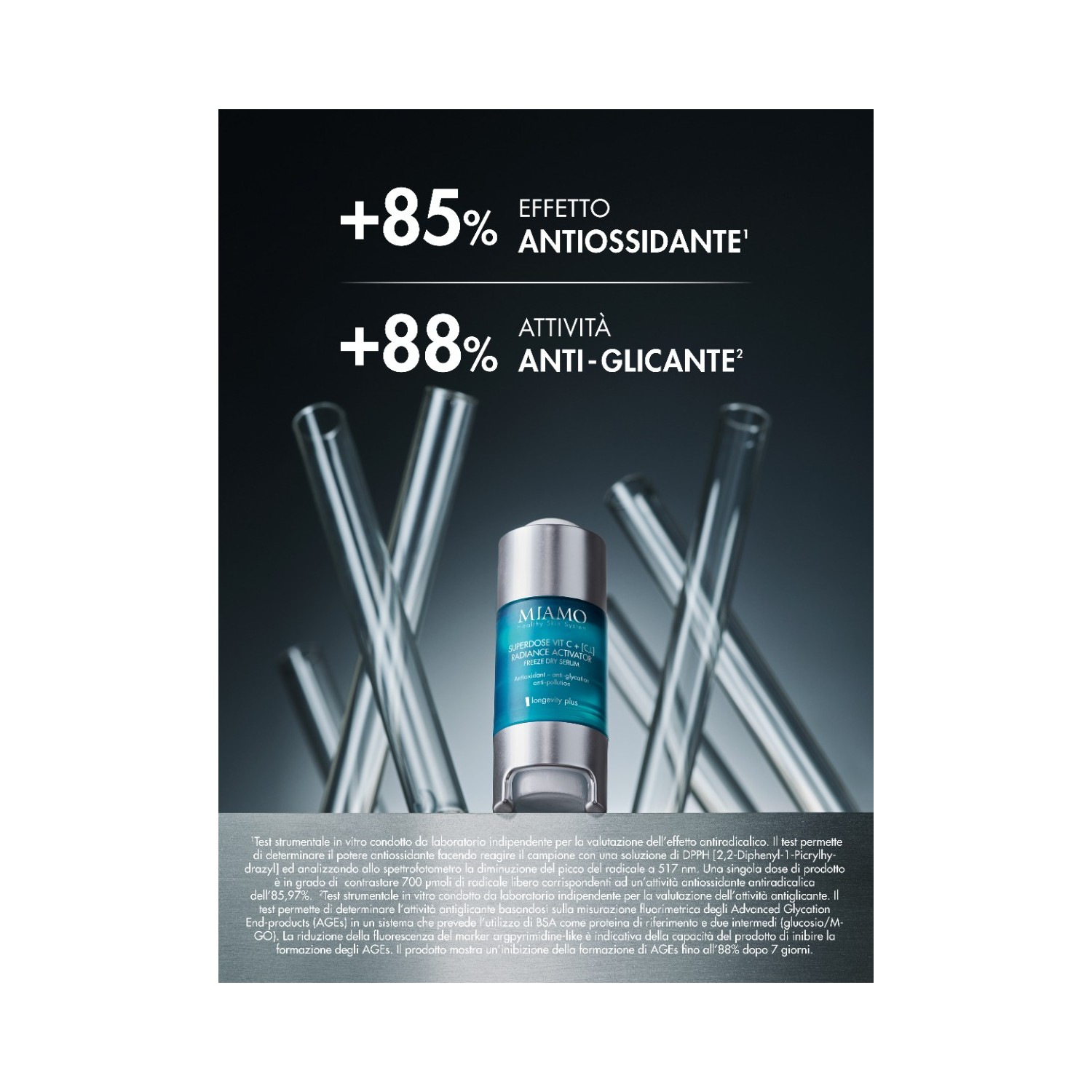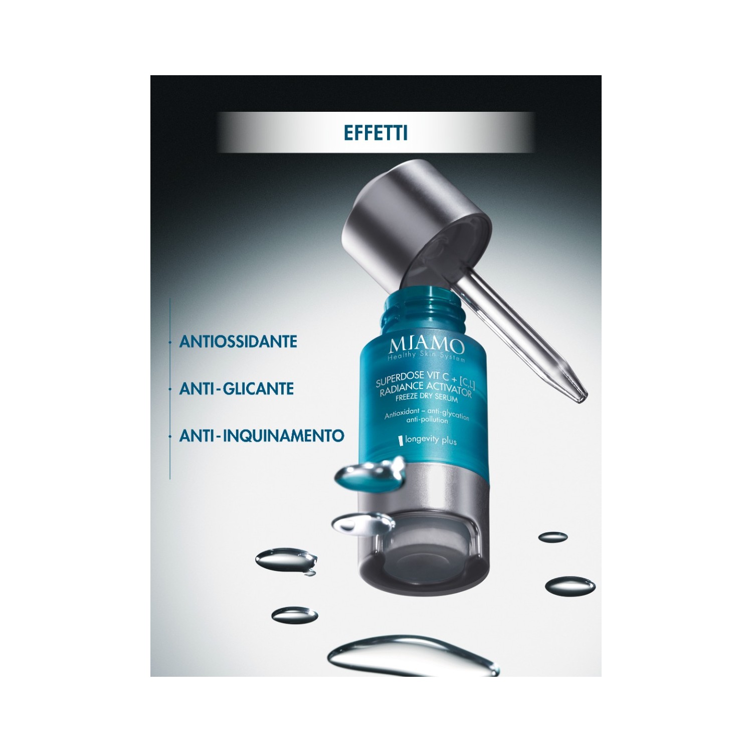 Superdose Vit C + [C,L] Radiance Activator è un siero avanzato formulato con innovativa tecnologia Freeze Dry, progettato per garantire la massima stabilità e biodisponibilità degli attivi. La formula combina una sinergia altamente performante di ingredienti funzionali. La Vitamina C (Acido L-Ascorbico liofilizzato), nella sua forma più pura e attiva, svolge un’intensa azione antiossidante, contribuisce a migliorare la luminosità cutanea e stimola la sintesi di collagene. I Peptidi di Carnosina: la carnosina è un attivo biomimetico multifunzionale capace di agire sui processi di glicazione, proteggendo le fibre dermiche dalla rigidità e contribuendo a preservare elasticità e integrità cutanea. Il lycopersicum leaf extract esercita un’efficace azione chelante, contrastando l’accumulo di metalli pesanti e agenti inquinanti responsabili dello stress ossidativo. Il centella triterpene complex, un complesso attivo a base di triterpeni purificati della Centella Asiatica (in particolare Madecassoside e Asiaticoside) svolge un’azione lenitiva, riparatrice e rinforzante della barriera cutanea aiutando a ridurre la reattività cutanea.